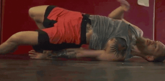Drop through your spine quickly while bending at the knees slightly. This should be done with a heavy drop of the head and a rapid "undoing" of the spine. Let's call it a ROLL-OVER. Rebuild upward.